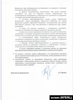 Ошондой эле каржылык операцияларды токтотуу тууралуу чечимге негиз болгон документтерди, Финансылык чалгын кызматынын эсепти бөгөттөө чечиминин көчүрмөсүн да тез арада берүүнү өтүнөт.